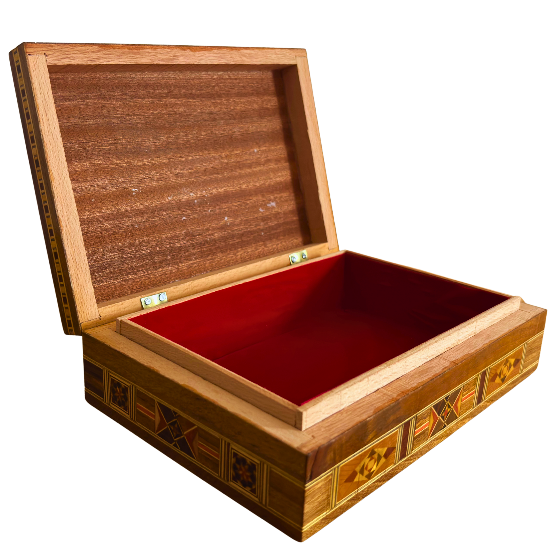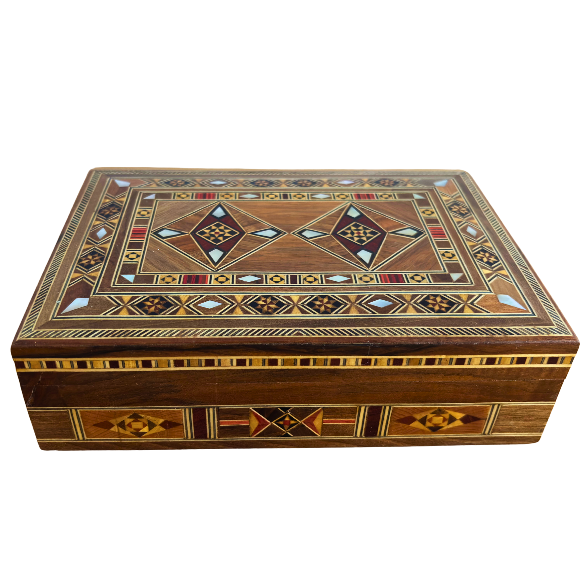 Bu zarif dikdörtgen mozaik kutu, usta zanaatkârlar tarafından özenle el yapımı olarak hazırlanmıştır. Okaliptüs, ceviz, gül, kayın, limon ve sarı çam ağaçları kullanılarak yapılmış ve parıldayan sedef kakmalarıyla süslenmiştir. Karmaşık geometrik Damask desenleri, Suriye zanaatkârlığının zengin sanatsal mirasını yansıtır.